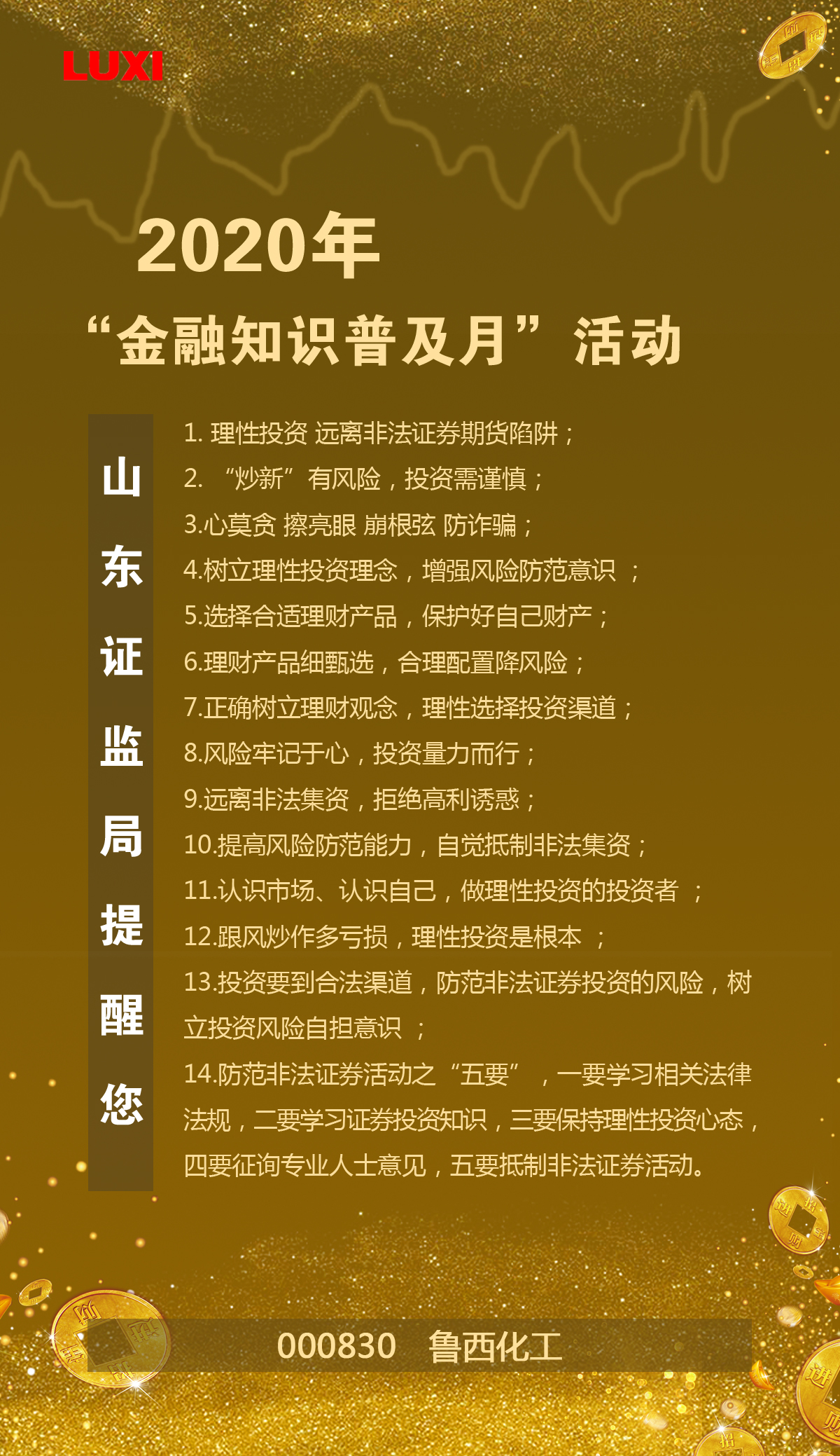 2020年“金融知識普及月”活動,山東證監局提醒您:1. 理性投資 遠離非法證券期貨陷阱; 2. “炒新”有風險,投資需謹慎; 3.心莫貪 擦亮眼 崩根弦 防詐騙; 4.樹立理性投資理念,增強風險防范意識 ; 5.選擇合適理財產品,保護好自己財產; 6.理財產品細甄選,合理配置