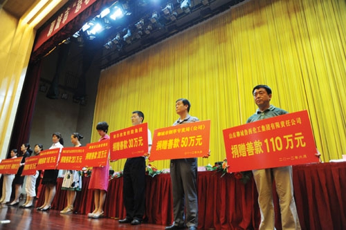 會(huì)議傳達(dá)了省市主要領(lǐng)導(dǎo)對慈善捐助工作的重要批示,對2011年度慈善捐助工作先進(jìn)單位和個(gè)人進(jìn)行了表彰,市委副書記王忠林、副市長白志堅(jiān)參加會(huì)議并作重要講話,會(huì)議號(hào)召全市各界積極行動(dòng),參與慈善,愛心奉獻(xiàn)。集團(tuán)公司榮獲聊城市“最具愛心捐贈(zèng)企業(yè)”榮譽(yù)稱號(hào),集團(tuán)公司董事長張金成被授予聊城市“最具愛心慈善楷模”。會(huì)上,集團(tuán)公司副總經(jīng)理于清(右一)代表企業(yè)進(jìn)行了善款捐贈(zèng),充分體現(xiàn)出魯西化工對社會(huì)慈善事業(yè)的大力支持。