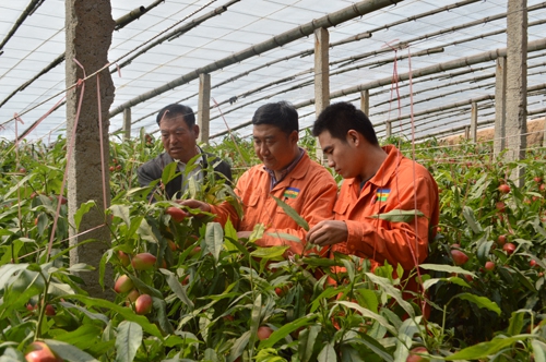 冠縣東古城李才村的劉尊慶大哥在魯西集團農化服務人員的指導下種植了5個油桃大棚,從選苗、種植、管理、施肥方面給予技術指導,經過幾年的發展,油桃的產量、質量穩定,尤其是油桃的品質方面,更是沒得說,個頭均勻、色澤紅潤,口感香甜中略微帶點酸味,酸甜爽口,很受客戶的喜愛。更難得的是劉尊慶種植的油桃比別家的早上市一個禮拜,搶占了市場先機,爭得了良好的價格優勢,因此經銷商每年都和劉大哥提前預定。