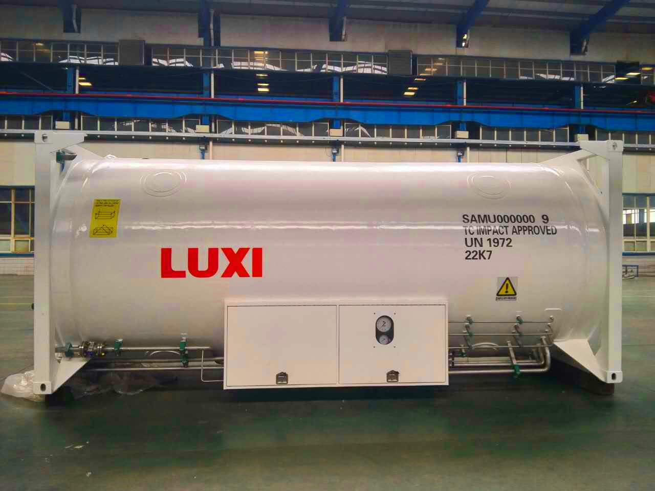 目前,魯西新能源裝備集團制作的T75罐箱有兩種規格:20英尺、40英尺。該產品是由低溫冷凍液體儲罐、氣化器、管系、閥門等設備集中安裝至標準尺寸金屬框架內,嚴格執行歐標ADR、EN13530、CSC、IMDG等國際標準規范,主要用于充裝液化天然氣(LNG)、液氧(LO2)、液氮(LN2)、液氬(LAr)等低溫液體,可用于公路、鐵路及水路運輸。罐箱相對于槽車和儲罐,有無可比擬的經濟、高效便捷、安全、美觀、環保等優勢。罐箱的使用,不會有繁瑣而耗時的槽車與儲罐等倒運過程,可在公路、鐵路、水路之間直接轉換運輸方式,操作簡單快捷,一步到位,可謂真正做到“門到門”運輸。
