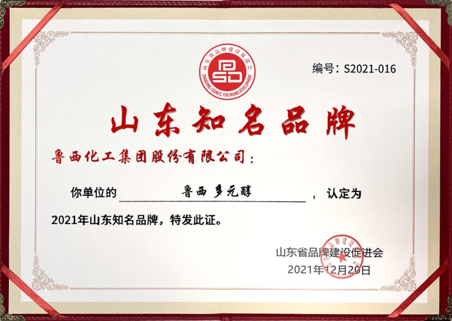 近日, 山東省品牌建設促進會在品牌年會上發布2021年度山東知名品牌認定名單,魯西集團“多元醇”產品榜上有名,榮獲“山東知名品牌”。